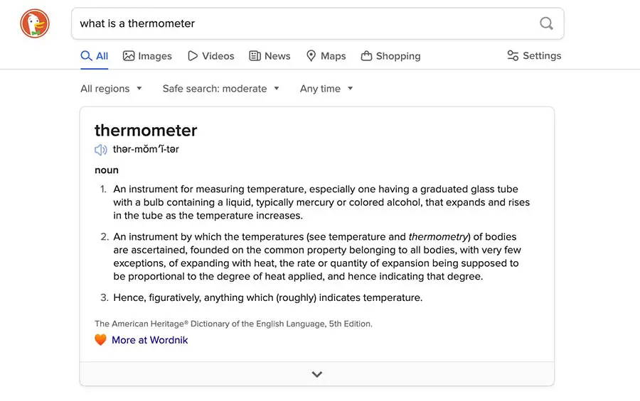 DuckDuckGo también proporciona Respuestas Instantáneas, las cuales son similares a los fragmentos destacados de Google. Sin hacer clic en un resultado específico, inmediatamente puedes ver la respuesta a una pregunta.
