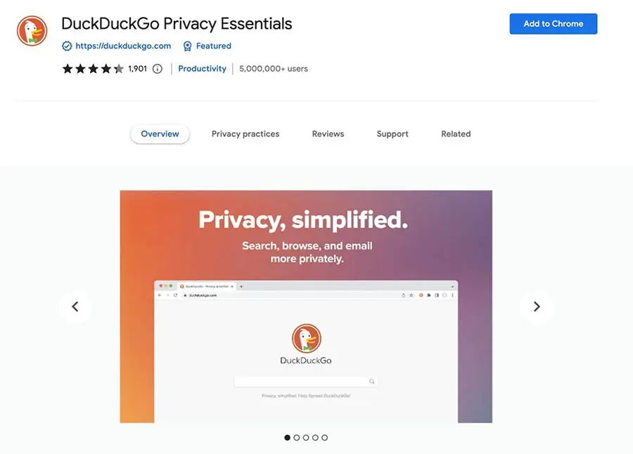 Junto con el motor de búsqueda estándar, DuckDuckGo tiene una extensión de navegador. La extensión de DuckDuckGo ‘Privacy Essentials’ añade automáticamente protección de rastreo para los usuarios de Chrome, Firefox y Safari.