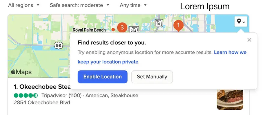 Algunas veces, querrás resultados un poco más acertados. Si DuckDuckGo necesita más información sobre tu ubicación, te llevará a la opción ‘Enable Location’: