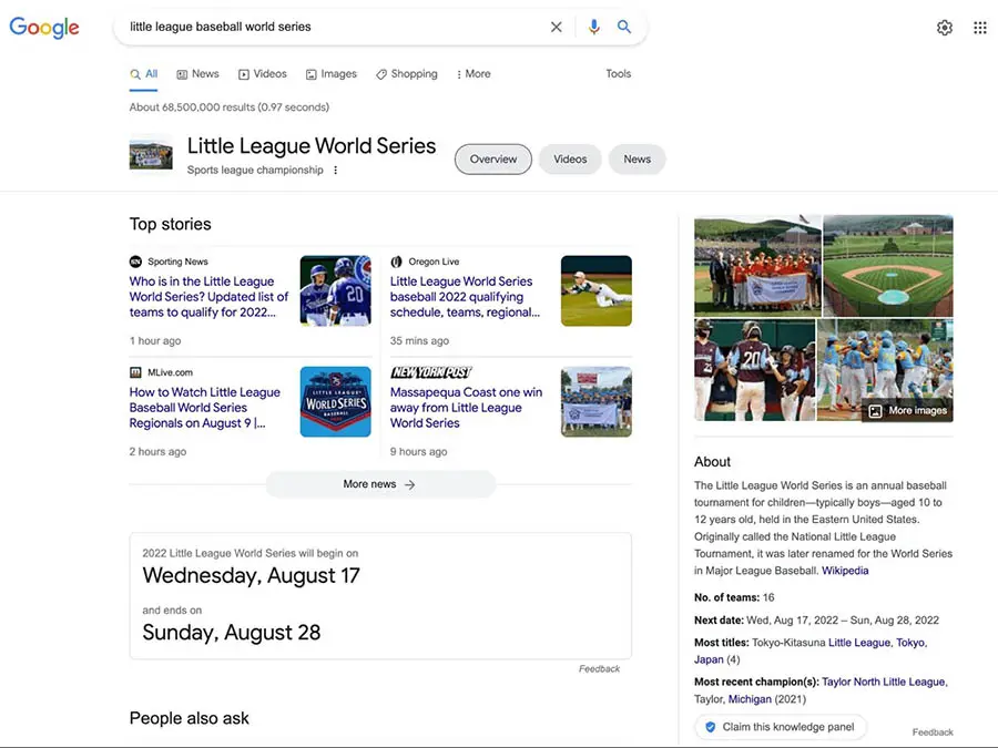 En la primera página de resultados, típicamente también verás un panel de conocimiento. Proporciona información básica proveniente de una página de Wikipedia.