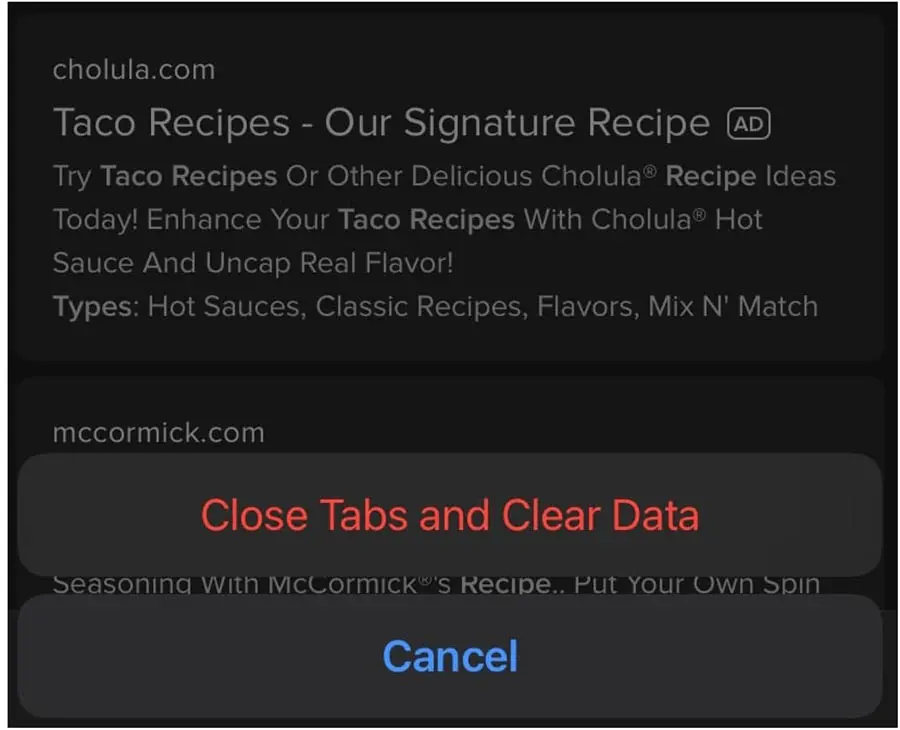 Para usar esta funcionalidad, haz clic en el ícono de fuego en la parte inferior de tu pantalla, Luego, selecciona las opciones ‘Close Tabs’ y ‘Clear Data’: