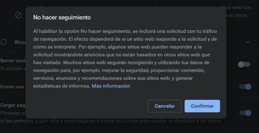 Luego, encuentra la configuración ‘Enviar una solicitud de no seguimiento con tu tráfico de navegación’. Enciende esto y haz clic en confirmar.