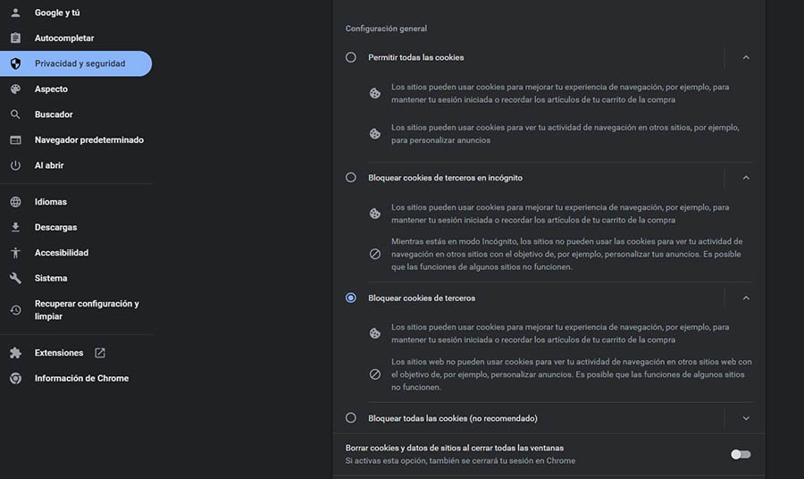 Si es necesario, también puedes limpiar tus cookies e información de sitio cuando cierras una ventana. Sin embargo, esta configuración automáticamente cerrará tu sesión en Chrome también.