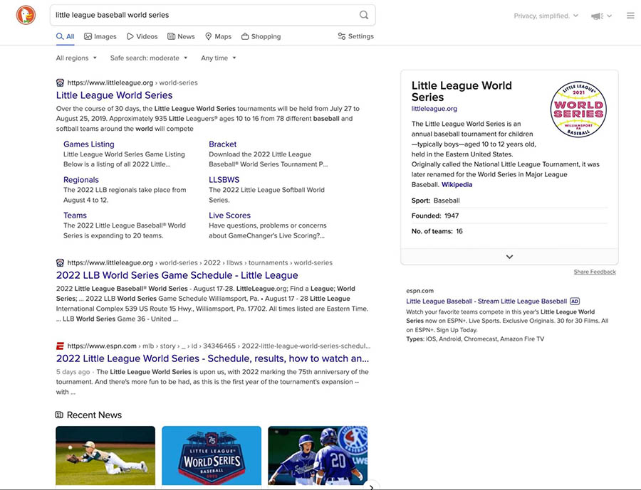 Cuando buscas contenido en DuckDuckGo, notarás un diseño similar al de Google. Ambos motores de búsqueda generan Páginas de Resultados de Motor de Búsqueda (SERPs) con 10 resultados orgánicos.