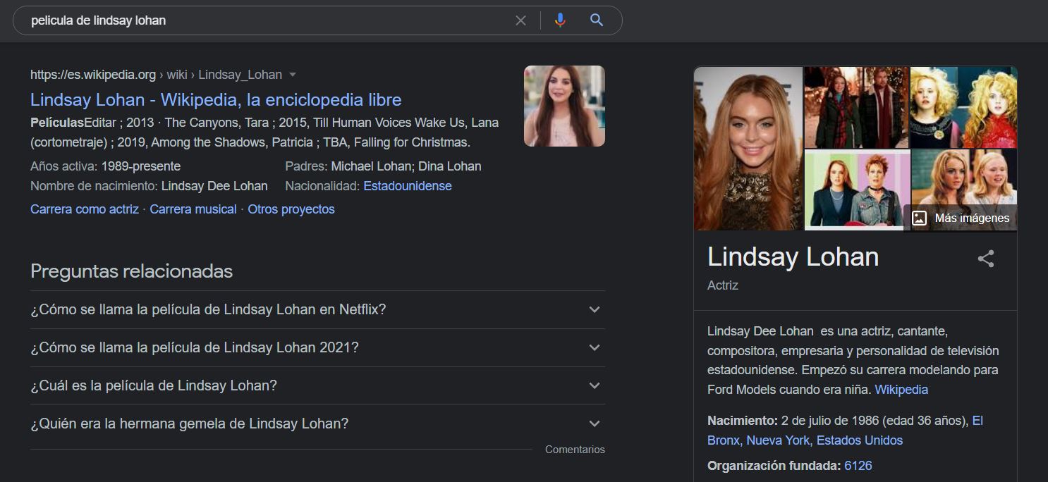 En la primera página de resultados, típicamente también verás un panel de conocimiento. Proporciona información básica proveniente de una página de Wikipedia.