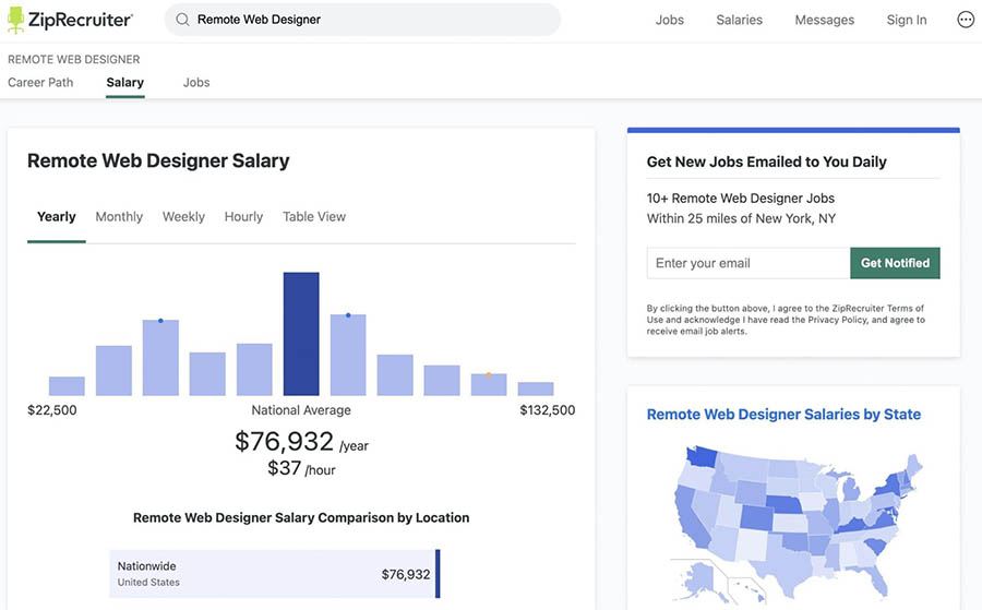 Ahora, veamos los salarios de diseñador web en los Estados Unidos.