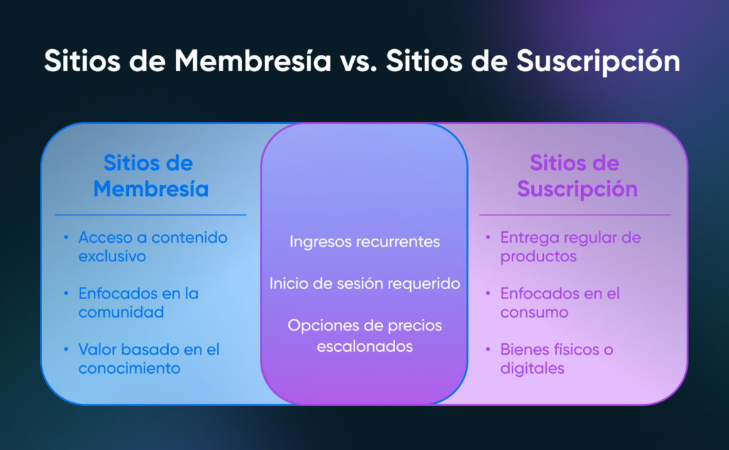 Los sitios de membresía ciertamente se superponen con los sitios de suscripción y pueden cobrar una tarifa recurrente, pero generalmente están menos enfocados en entregar un producto físico de manera regular.