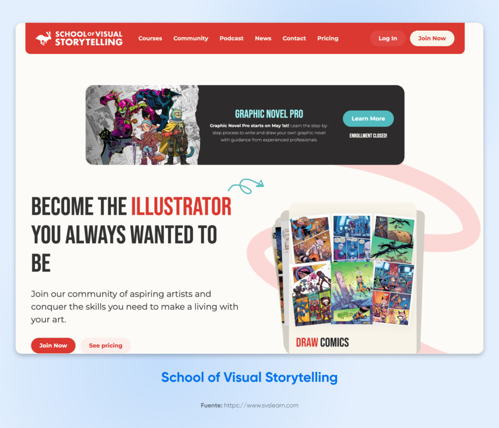 Artistas aspirantes, tomen nota: la School of Visual Storytelling ha construido un hermoso sitio web (¡por supuesto!) lleno de cursos autodidactas, clases en vivo y una comunidad robusta para ayudar a los ilustradores a llevar sus habilidades al siguiente nivel.