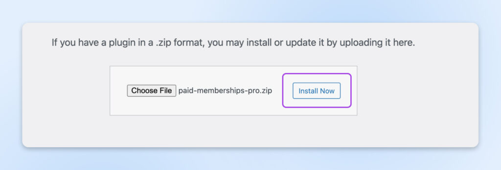 En la parte superior de la siguiente pantalla, selecciona Subir Plugin y luego arrastra el archivo ZIP que descargaste. Haz clic en Instalar ahora.