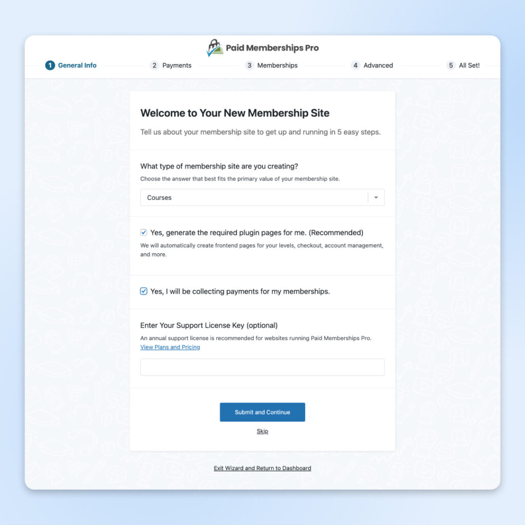 Con eso, es tan simple como seguir los pasos en la pantalla. Primero, responde algunas preguntas sobre la naturaleza de tu sitio de membresía.