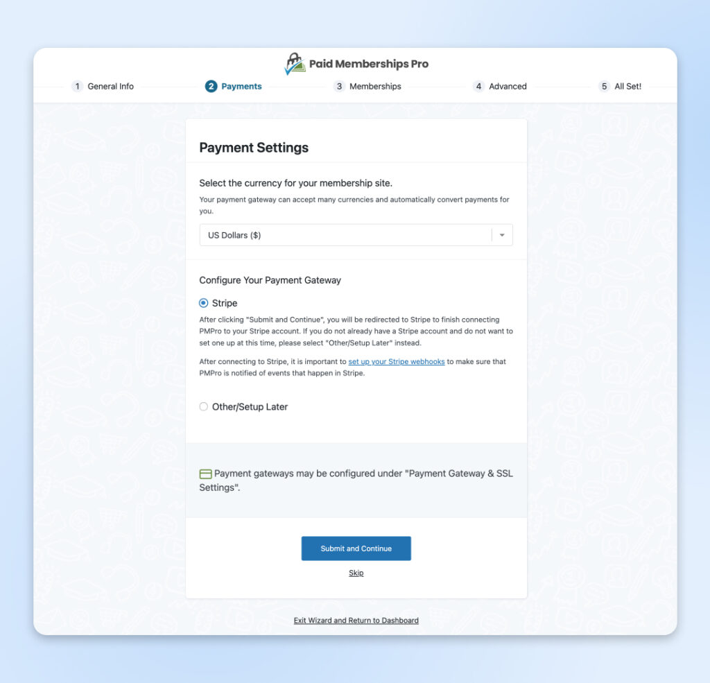 Como indicamos que recogeríamos pagos, configurar eso es lo siguiente. Para esta guía, elegiremos Otro/Configurar más tarde para saltarnos ese proceso y seguir personalizando nuestra instancia del plugin.