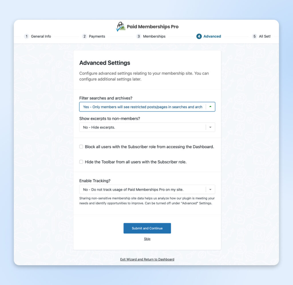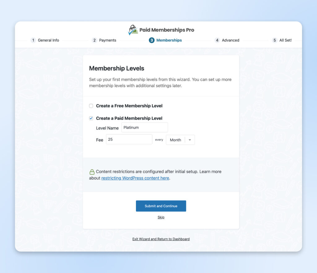A continuación, se te guiará para crear algunos niveles de membresía. Haz clic en Enviar y Continuar cuando termines para pasar al siguiente paso.