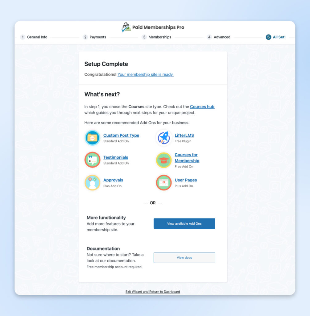 Finalmente, estarás en la última página del asistente de configuración. Hay varias opciones para elegir. Puedes ver tu sitio, revisar los recursos relacionados con el tipo de sitio que elegiste anteriormente (verás que elegimos Cursos), revisar más documentación de configuración o visitar algunas de las muchas opciones de plugins.