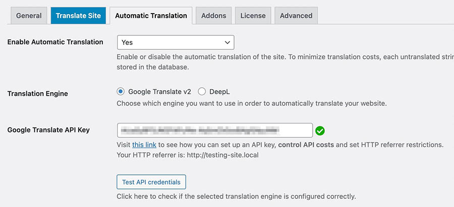 Ahora, puedes regresar a tu panel de WordPress y pegar tu ‘API key’ o llave de API en la configuración ‘Automatic Translation’. Si está funcionando correctamente, deberías ver una marca de verificación verde.