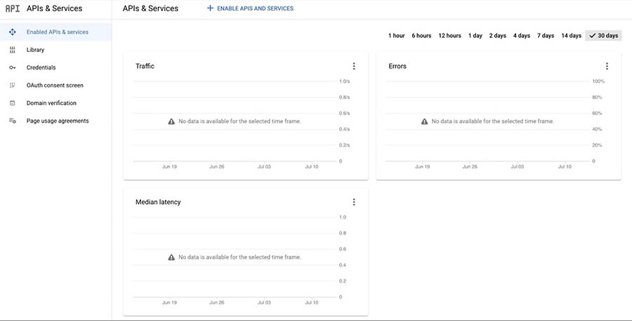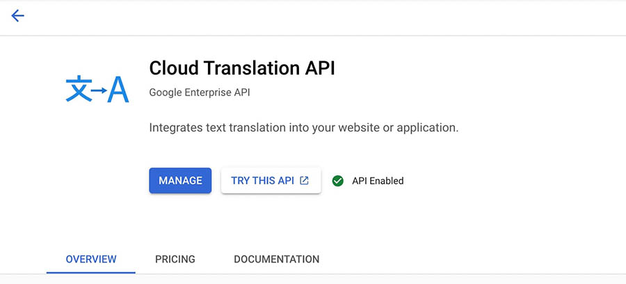 En la parte superior de la página, haz clic en ‘Enable APIs and Services’. Busca el API ‘Cloud Translation’ y habilítala.
