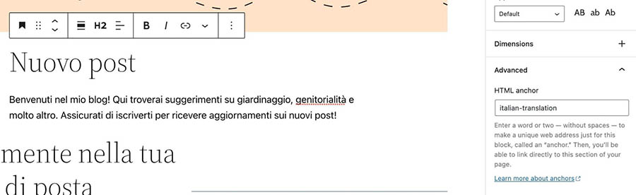 Una vez que has finalizado, haz clic en el encabezado de la sección traducida. Abre las configuraciones ‘Avanzadas’ y encuentra el ancla HTML.