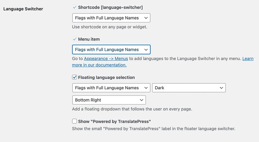 A continuación, desplázate a la configuración ‘Language Switcher’. Con TranslatePress, puedes mostrar tu selector de idioma con shortcodes, como parte del menú principal, o como un menú flotante de selección de idioma.