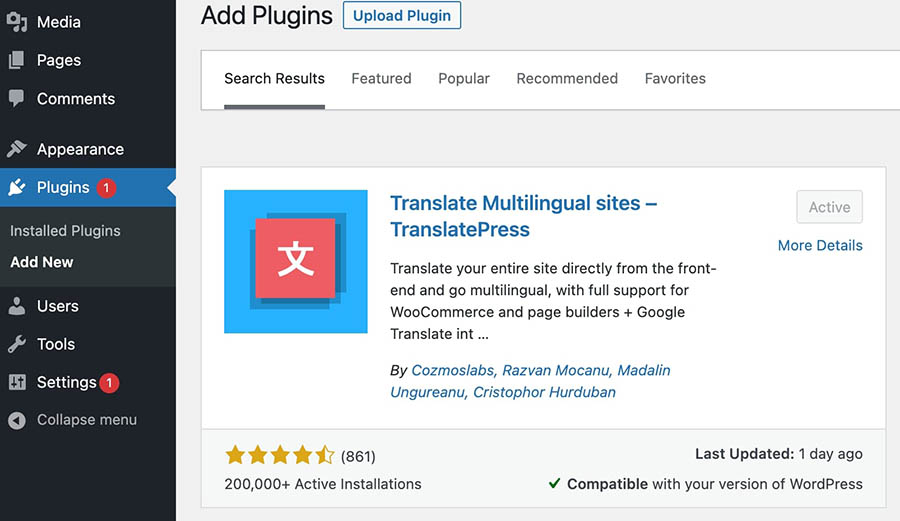 Con TranslatePress, puedes añadir un selector de idioma a tu sitio en solo unos cuantos pasos. Primero, instala y activa el plugin.