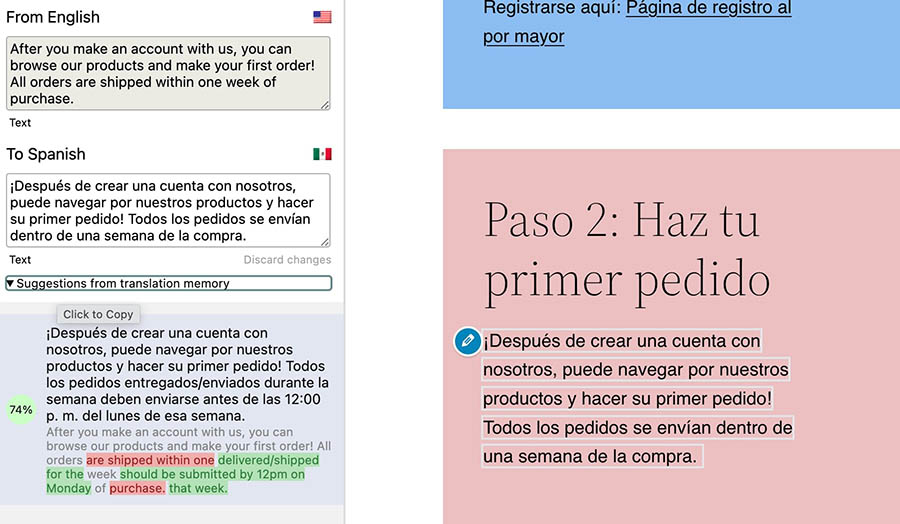 Afortunadamente, puedes solucionar cualquier problema que las máquinas de traducción puedan realizar manualmente y ver una vista previa de estos cambios durante el proceso de edición.