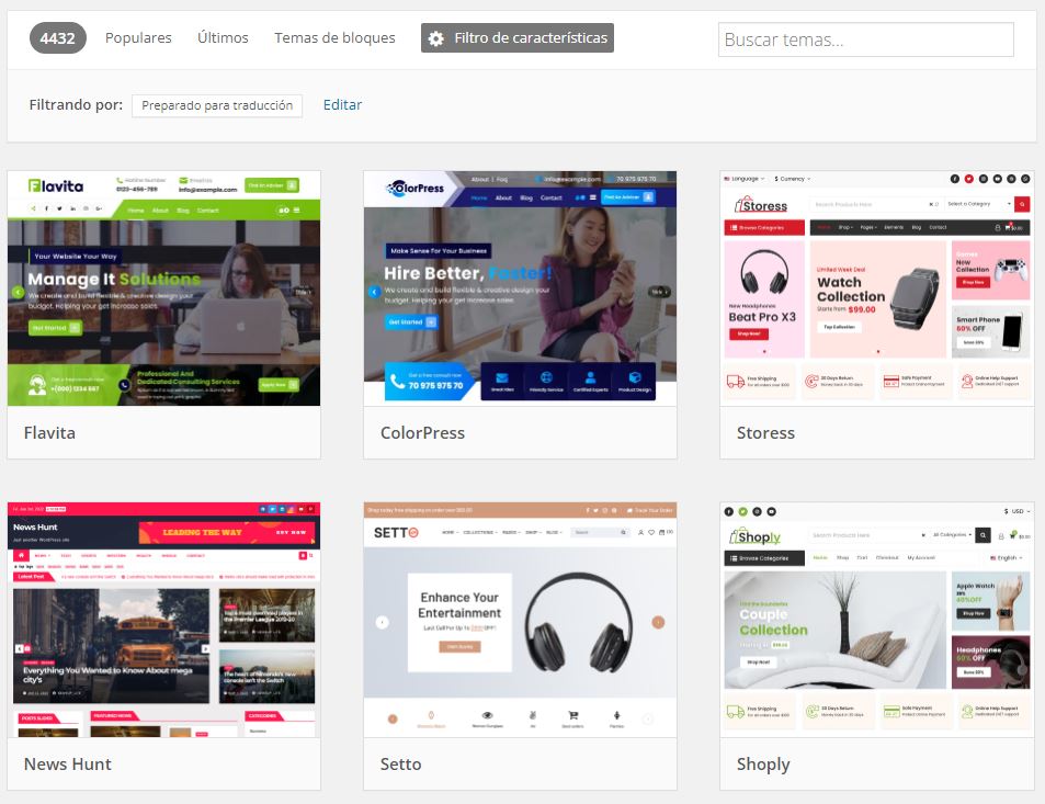 Esto excluirá cualquier tema de WordPress sin soporte multilingüe. Después de navegar estos resultados, puedes instalar y activar un tema listo para traducciones.