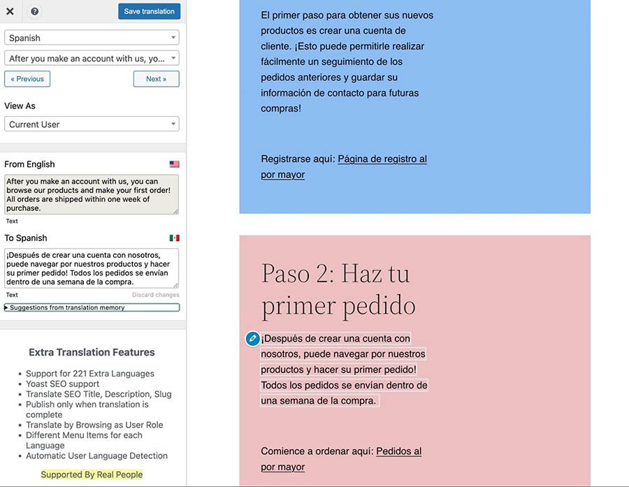 Si hablas el idioma traducido, puedes cambiar cualquier frase extraña usando la casilla de texto en la parte izquierda. Para ayudarte aún más, TranslatePress puede proporcionar sugerencias de traducción.