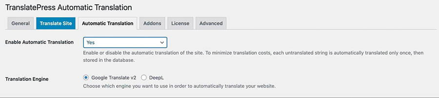 En la parte superior de la página, selecciona ‘Sí’ en el menú desplegable junto a ‘Enable Automatic Translation’. Luego, elige el motor de traducción que deseas utilizar.