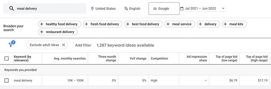Por ejemplo, las palabras clave ‘entrega domicilio’ tiene una alta cantidad de búsquedas y competencia. Con una oferta costosa para la parte superior de la página, es posible que no quiera usarla: