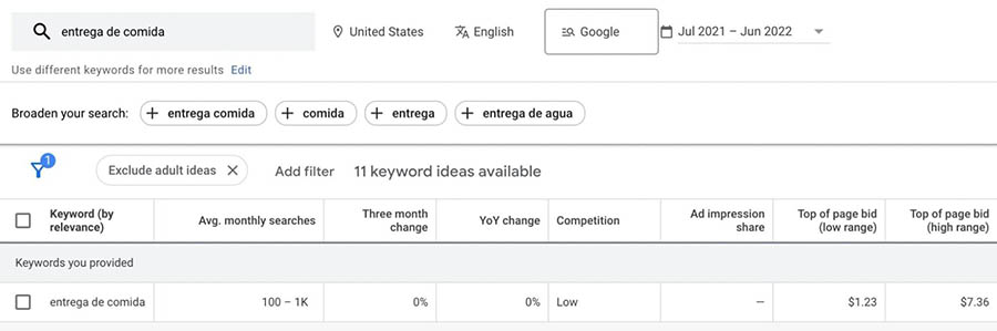 Sin embargo, usar ‘Food delivery’ puede mejorar tus resultados. Al simplemente traducir tu palabra clave a Inglés, puedes ejecutar una campaña rentable de anuncios sin competir con otros sitios web.