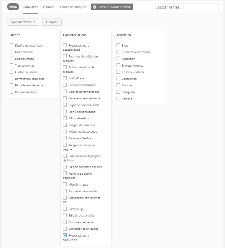 Para encontrar un tema multilingüe, puedes aplicar un filtro en el Directorio de Temas de WordPress. Allí, haz clic en la opción ‘Filtro de Características’ y selecciona a continuación ‘Preparado para Traducción’.