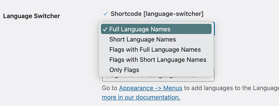 Para cualquier opción, puedes personalizar la apariencia del selector de idioma. Al usar el menú desplegable, puedes elegir mostrar los nombres de los idiomas, banderas o ambos.