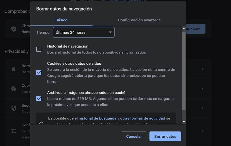 - Chrome: Haz clic en el botón de menú > Borrar datos de navegación