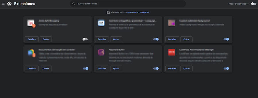 Intenta desactivar las extensiones innecesarias una por una y volver a cargar los sitios afectados para verificar si alguna extensión causa problemas: