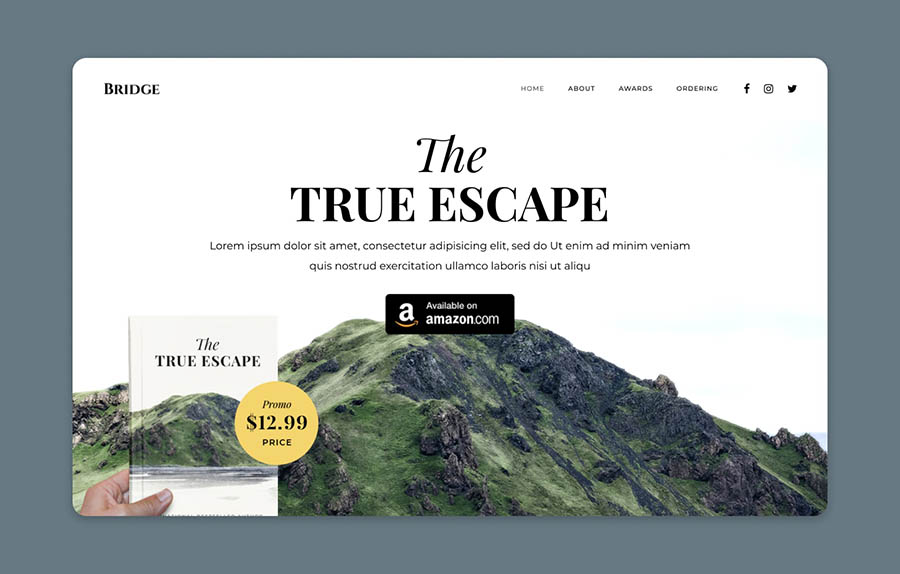 Muestra, con este diseño, tu obra principal, junto a un botón de compra. Más abajo, verás siete secciones para “jugar”, como una caja de pestañas, que te dará vistas preliminares por fragmentos. Aunque parece ideal para libros de no ficción, puedes usarlo para promover el que tú quieras.