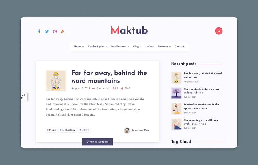 En el otro extremo del espectro de diseño web, encontrarás Maktub. Este colorido tema te brinda contenido con impacto visual, aunque se enfoca en la tipografía.