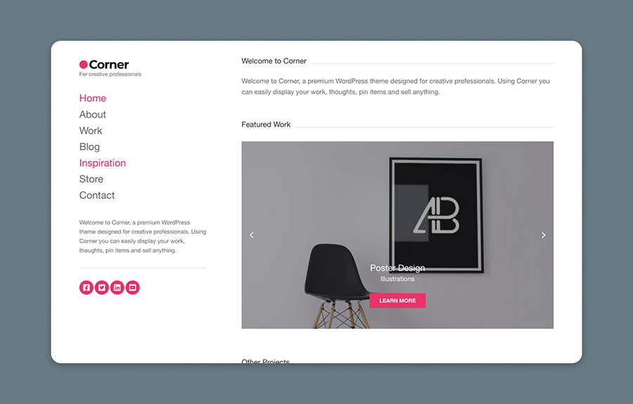 Una parte clave para asegurar un trabajo como escritor, es impresionar posibles clientes con tu obra previa. Corner tiene una sección de portafolio para esto, con varias opciones de diseño de donde elegir.