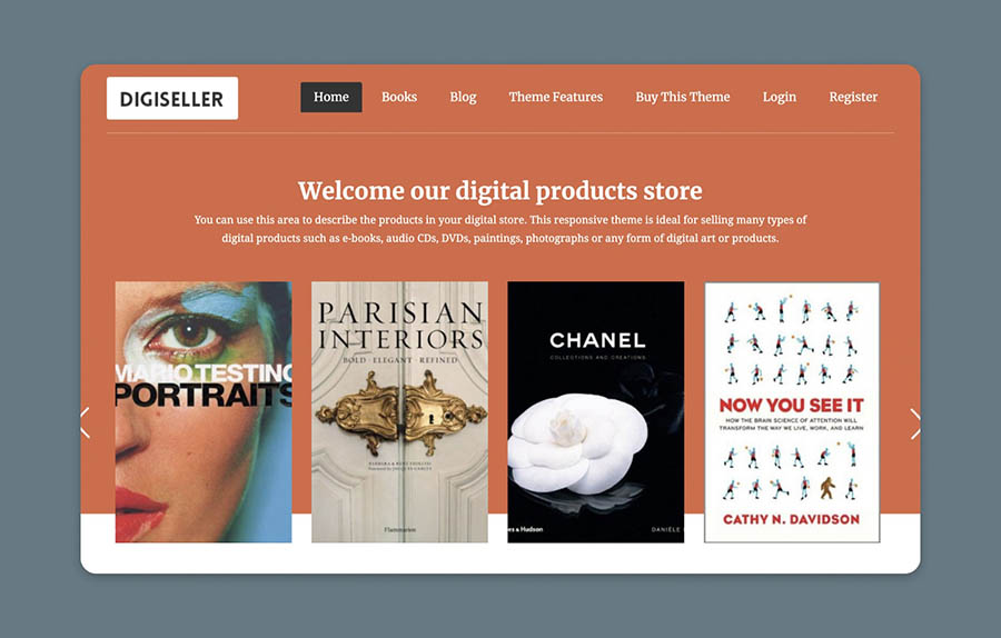 Ya mirando un aspecto más comercial, Novela te permite configurar y vender descargas digitales. De hecho, todo el tema está optimizado específicamente para la venta de e-books.