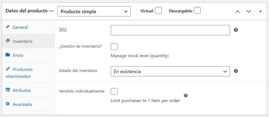 Las demás pestañas del apartado de Datos del producto dependen mucho de qué clase de artículo estés vendiendo. Por ejemplo, la pestaña del inventario te permite definir números de identificación para cada producto y configurar cuantos artículos tienes en existencia o en stock: