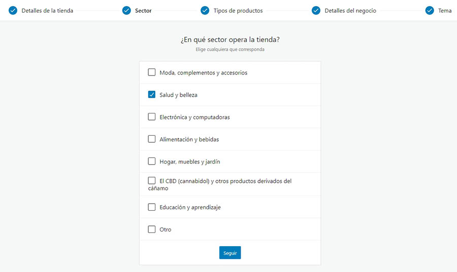 Estos datos son importantes, ya que WooCommerce los utilizará para ayudarte a calcular los costos de envío, emitir facturas y calcular impuestos de venta en caso de que sea necesario. Para continuar, simplemente haz clic en el botón de ‘Seguir’.