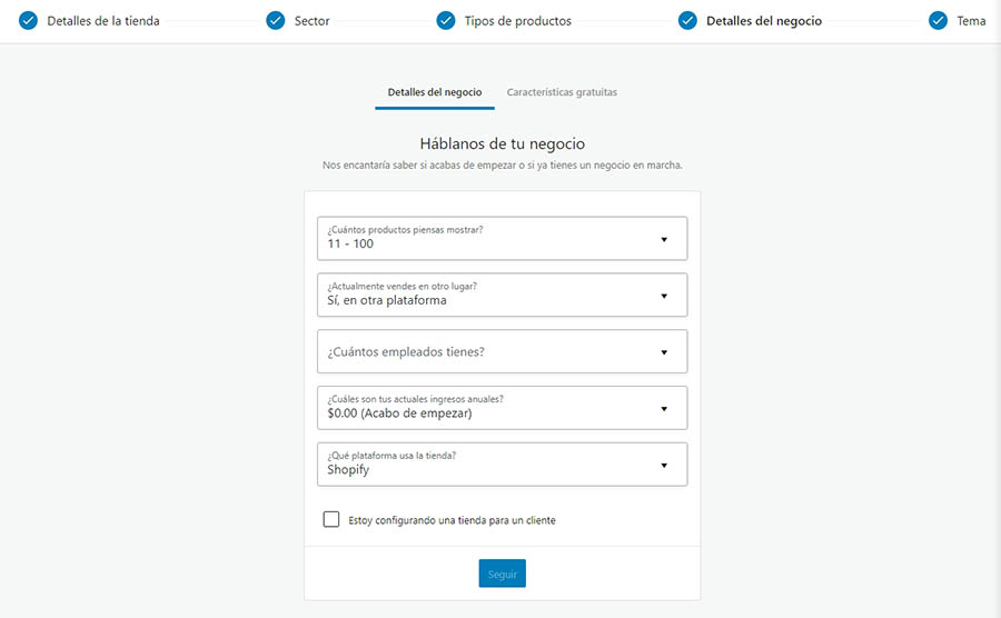 A continuación, WooCommerce te pedirá algunos detalles básicos sobre tu tienda, como la cantidad de productos que piensas mostrar, si tienes empleados y si posees alguna otra tienda online:
