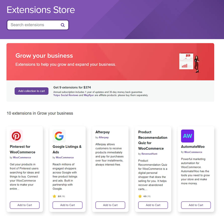 También, notarás que con WooCommerce tienes la opción de vender membresías, reservas, lotes y productos personalizables. Sin embargo, ten en cuenta que todas estas categorías requieren que pagues por extensiones adicionales.