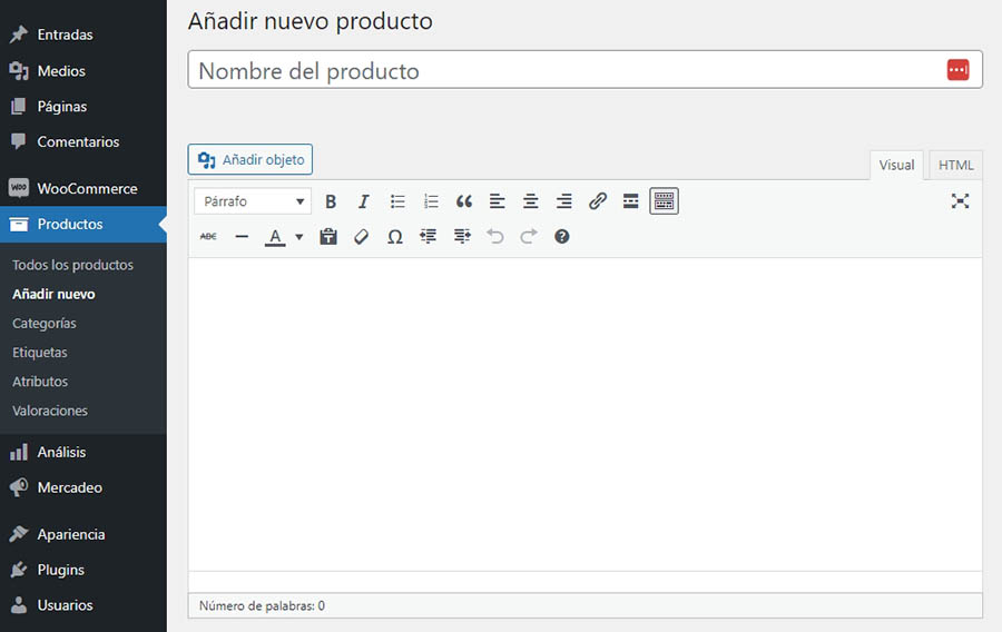Es hora de publicar los productos que planeas vender. Para crear un artículo, dirígete a ‘Productos > Añadir nuevo’ en tu escritorio WordPress. Una vez que estés allí, verás el editor de WordPress y podrás escoger un nombre y escribir una descripción para el producto que quieres publicar:
