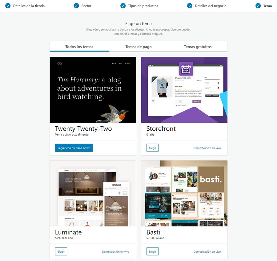 Finalmente, podrás escoger un tema base para tu sitio WordPress. WooCommerce te recomendará varias opciones compatibles con el plugin. Muchas de estas opciones son de pago, así que te aconsejamos usar el tema Storefront (gratis) para empezar:
