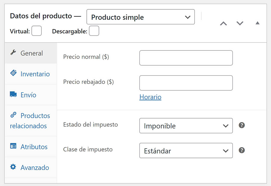 Para empezar, selecciona qué tipo de producto quieres vender usando las opciones bajo el menú de Datos del producto. Luego, dirígete a la pestaña de configuración general para definir el precio del producto en cuestión. En esta pestaña también podrás configurar las opciones de los impuestos y el envío del producto, las cuales configuraremos luego.