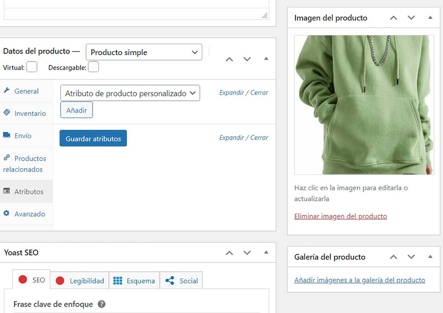 Si la categoría que quieres usar no existe todavía, haz clic en Añadir nueva categoría. Después de establecer la categoría del producto, puedes agregar imágenes usando los menús de Imagen del producto y Galería del producto: