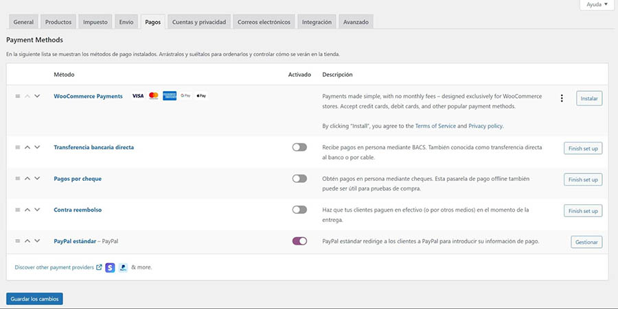Antes de que puedas empezar a vender productos usando WooCommerce, necesitarás escoger las opciones de pago que vas a aceptar en tu tienda. Para comenzar, dirígete a la pantalla de WooCommerce > Ajustes > Pagos. En esta pantalla, podrás ver todas las opciones de pago que WooCommerce ofrece: