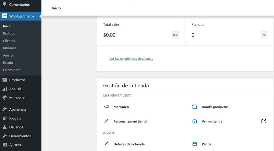 Para hacerte una idea de cómo funciona WooCommerce, aquí tienes una captura de cómo se ve el escritorio de WordPress después de activar el plugin: