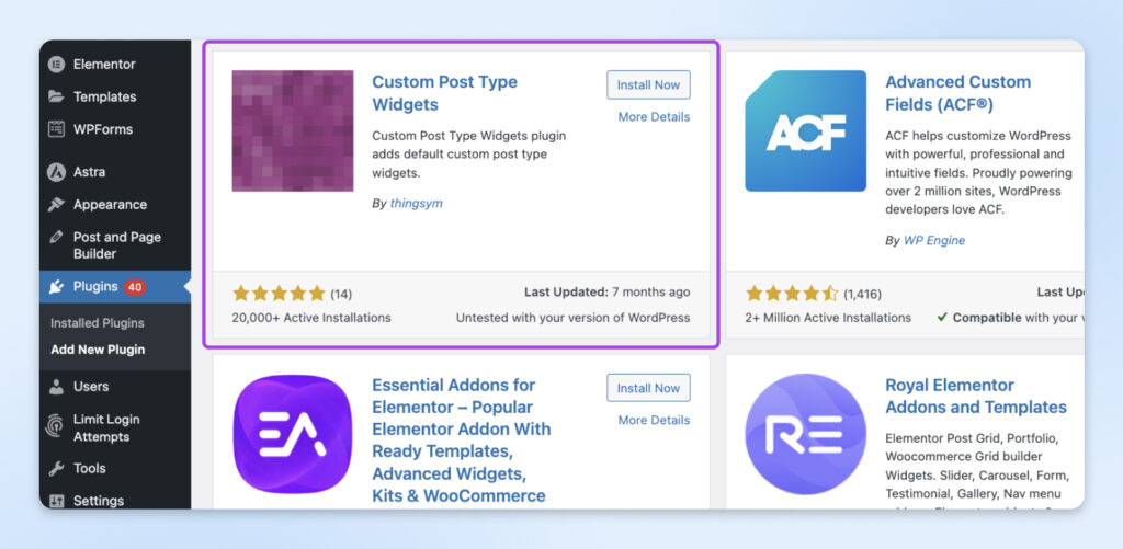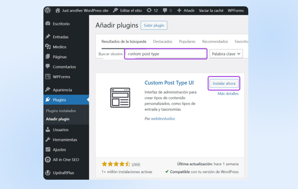 1. Instala el plugin: En el área administrativa de WordPress, ve a Plugins > Añadir Plugin, y busca “Custom Post Type UI”. Haz clic en “Instalar Ahora“.