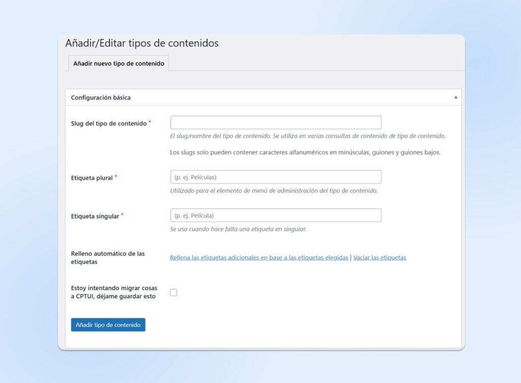5. Publica: Una vez que hayas terminado, haz clic en el botón azul “Añadir Tipo de Publicación” para crear tu nuevo CPT.