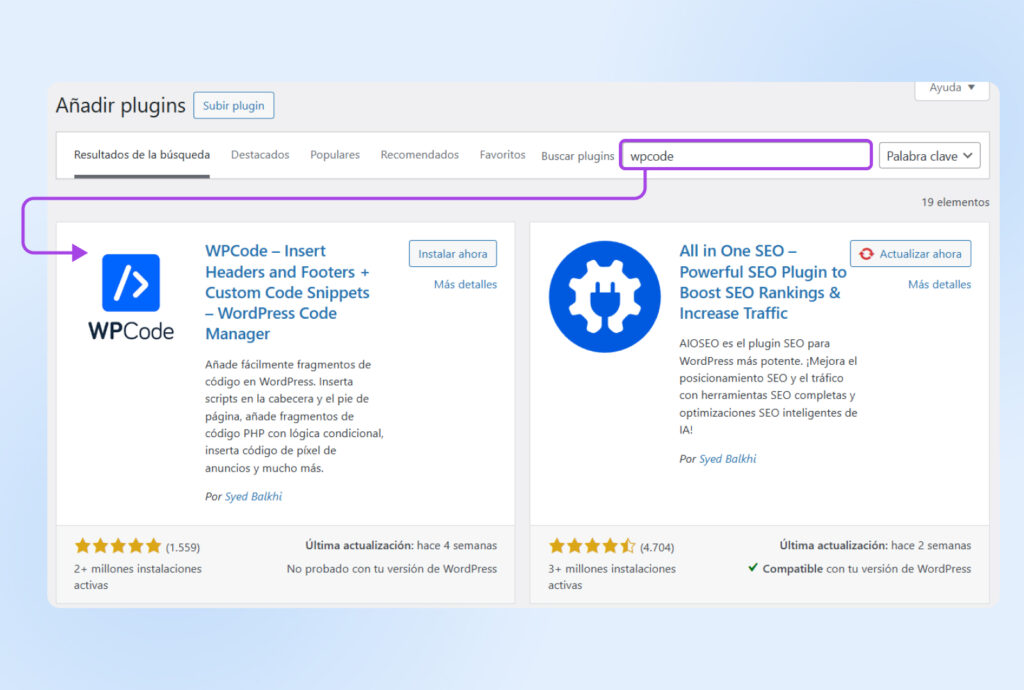 1. Instalar el plugin WPCode: En la barra lateral, ve a Plugins > Añadir Plugin y busca “WPCode”. Instálalo y actívalo.