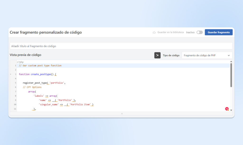 3. Crea tu fragmento: En el panel emergente, elige “Fragmento PHP“.